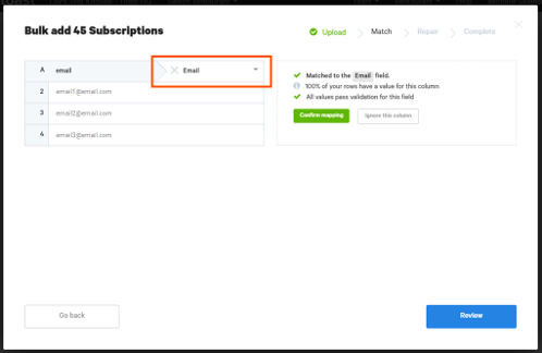 - When you're finished, select Confirm mapping. Any data other than an email address will be discarded.