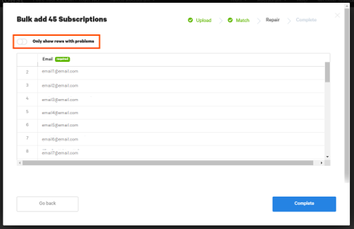 - Review the email addresses listed. Use the toggle at the top of the page to identify any invalid email addresses and correct them by typing directly into the cell.