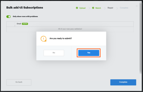 - In the Bulk add Subscriptions pop-up, select Upload data from file and choose the desired .tsv or .csv file from your computer.