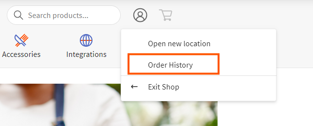 You can access your order history by opening the Account menu (located next to the search bar at the top of your Toast Shop page) and selecting Order History.